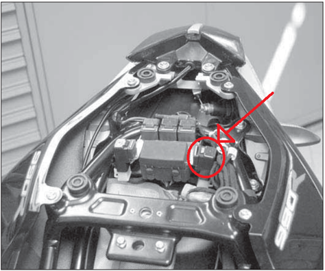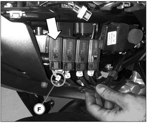 Under the pillion seat on the left side marked with the letter “F”.